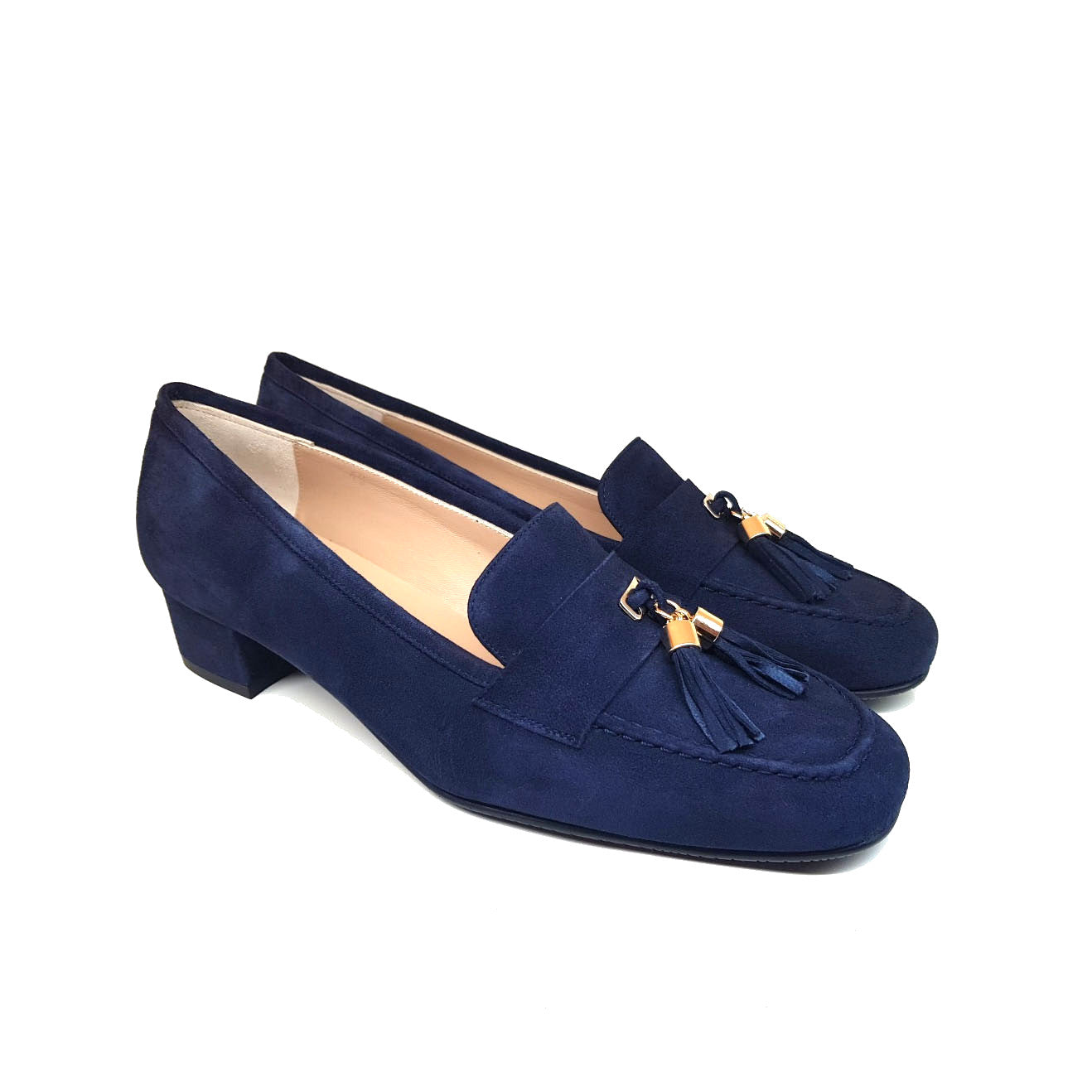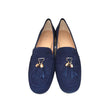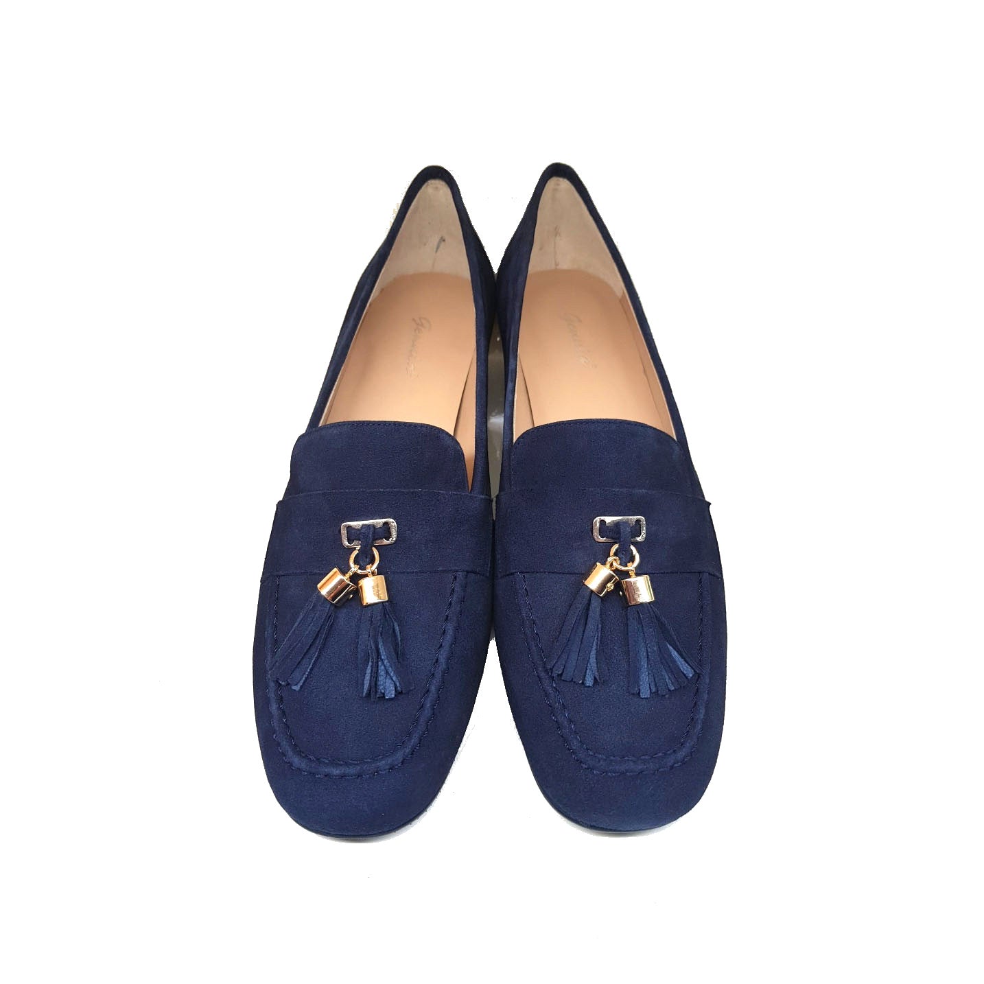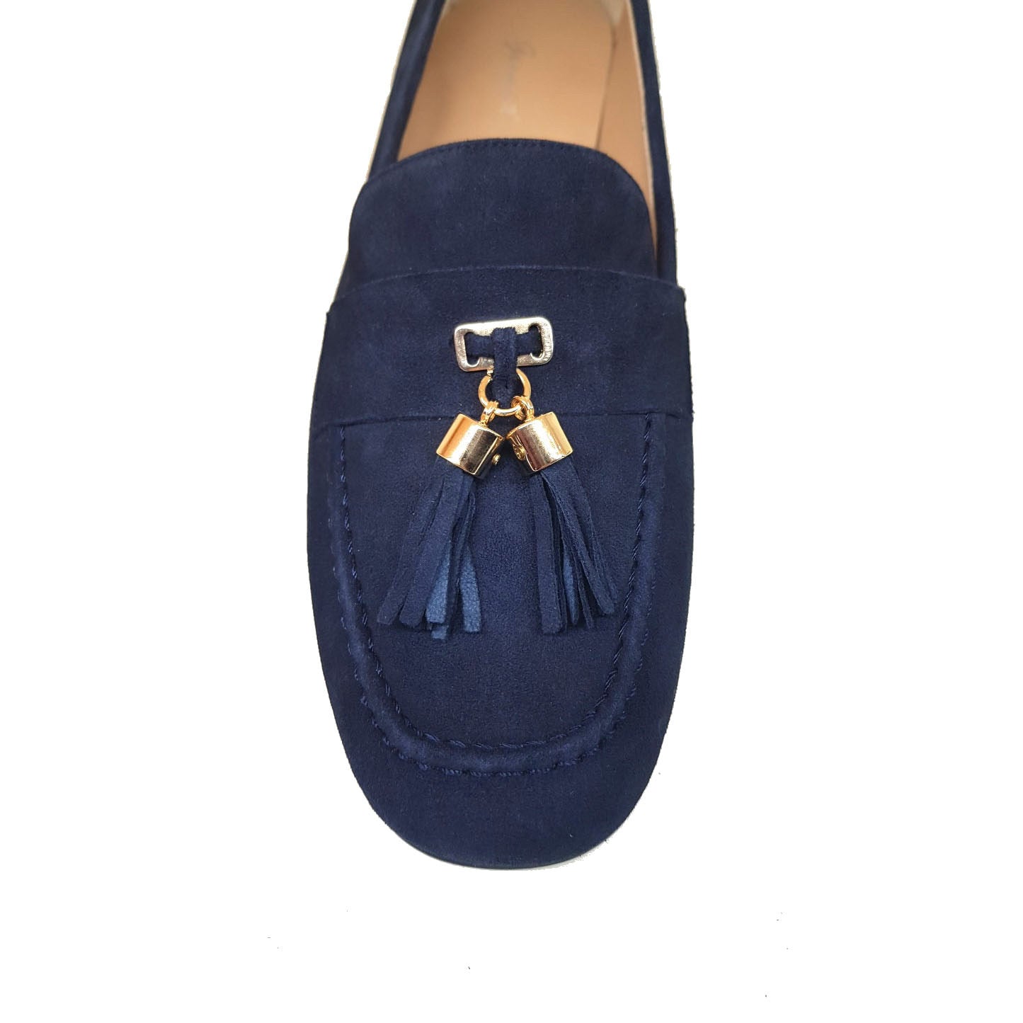 Damenmokassin mit dekorativen Trotteln auf dem Vorderblatt und abgerundeter Karreeform.